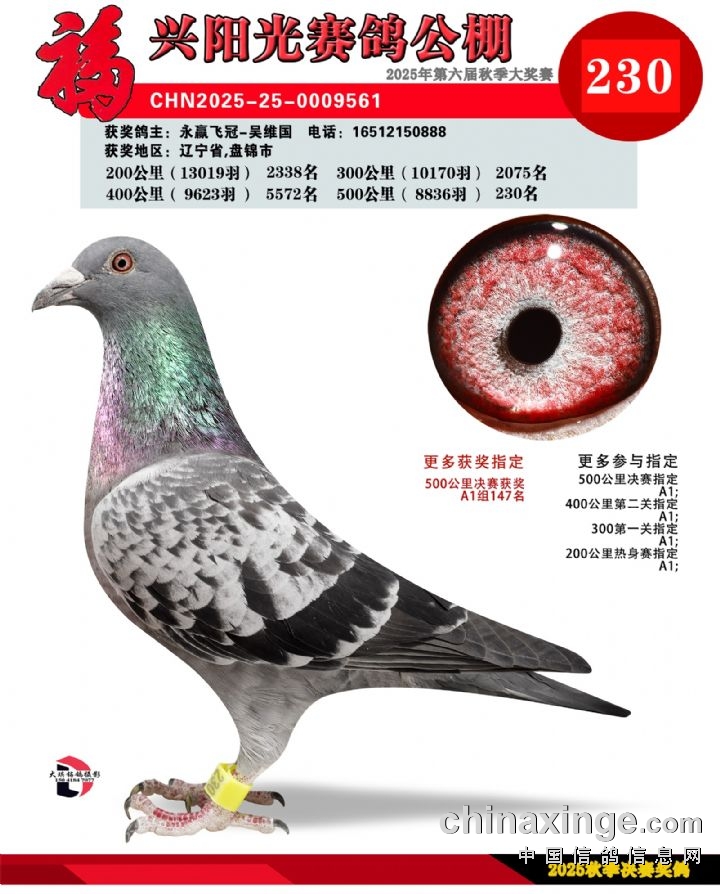 • 辽宁福兴阳光公棚加站赛冠军-30名获奖鸽照片 (2025-11-5 9:30:42)