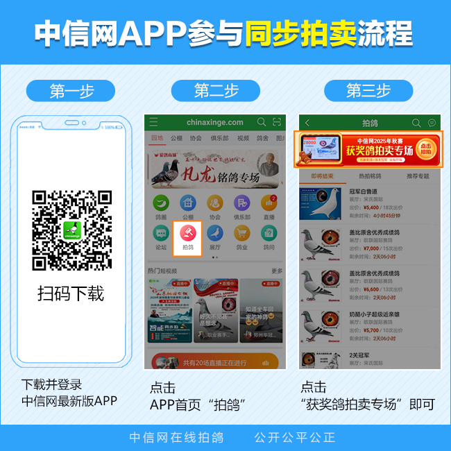 网上得标的鸽友可以委托朋友代为现场取鸽,取鸽步骤:①登录会员区结算订单;②查看订单编号,点现场取鸽按钮,获取订单取鸽验证码,系统会自动发送手机短信到拍卖会员指定手机;③将验证码报给公棚工作人员,验证成功;④签发取鸽凭证,交接拍卖鸽。