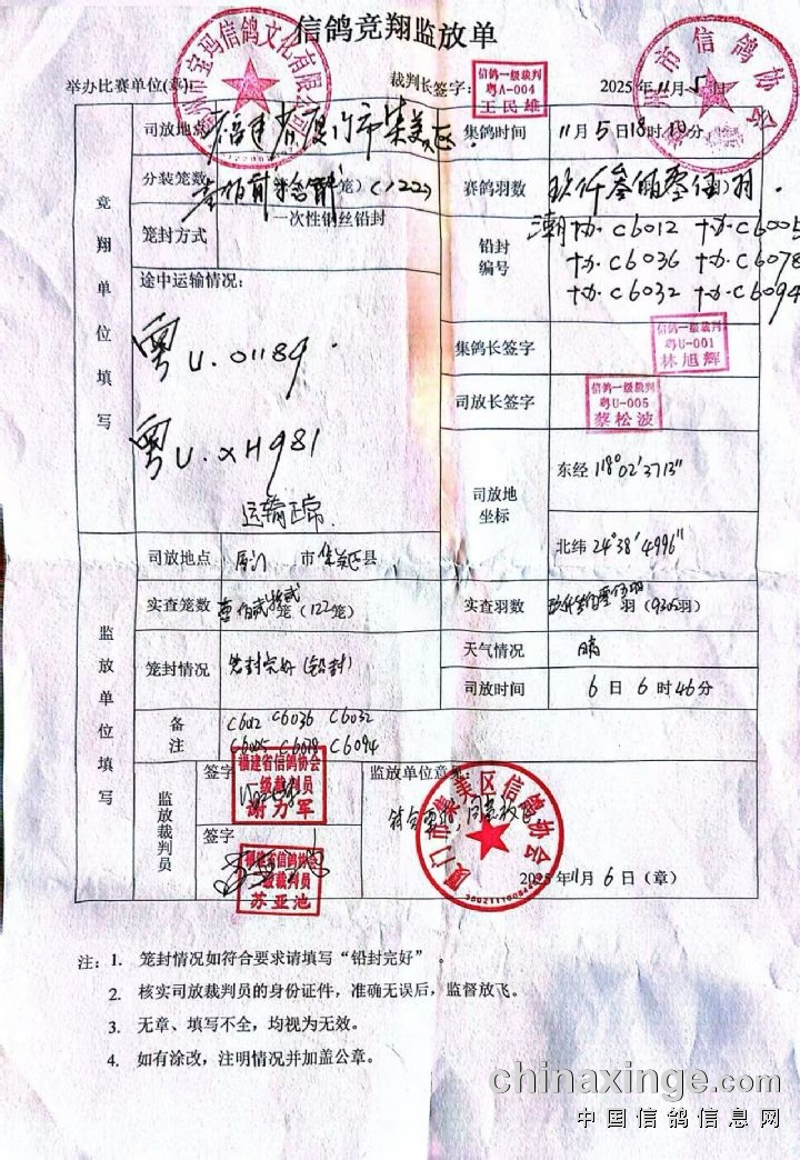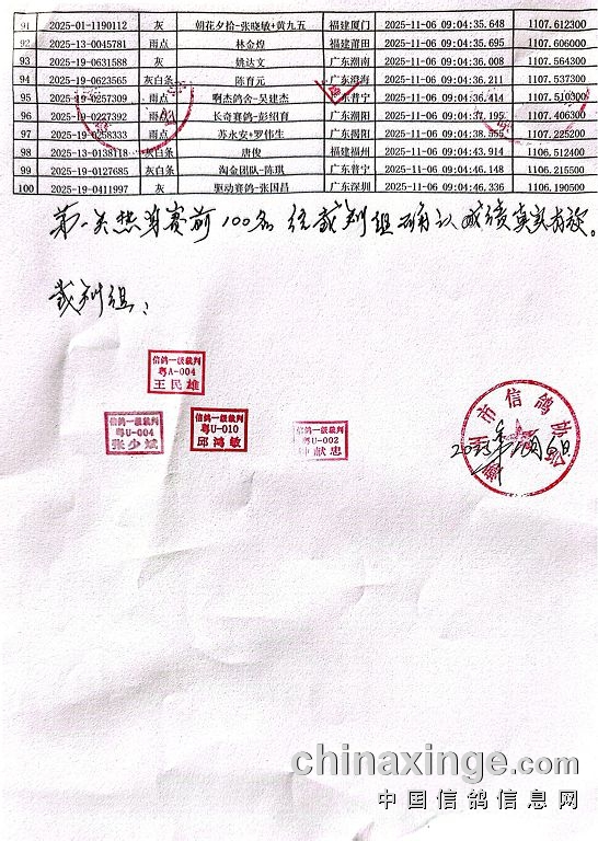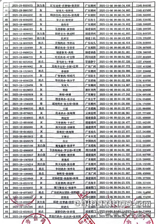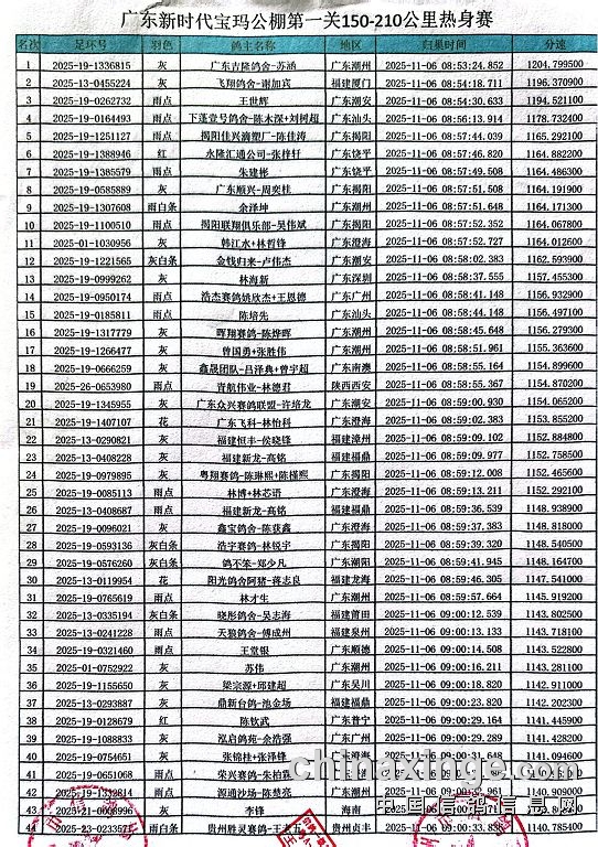• 广东新时代宝玛(秋棚)第一关(150-210公里)单羽常规赛获奖名单(名单公示2天,无异议即发放奖金) (2025-11-6 19:08:44)
