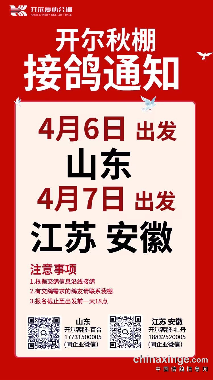 开尔爱心公棚(大棚)4月6日山东,4月7日江苏、安徽接鸽通知