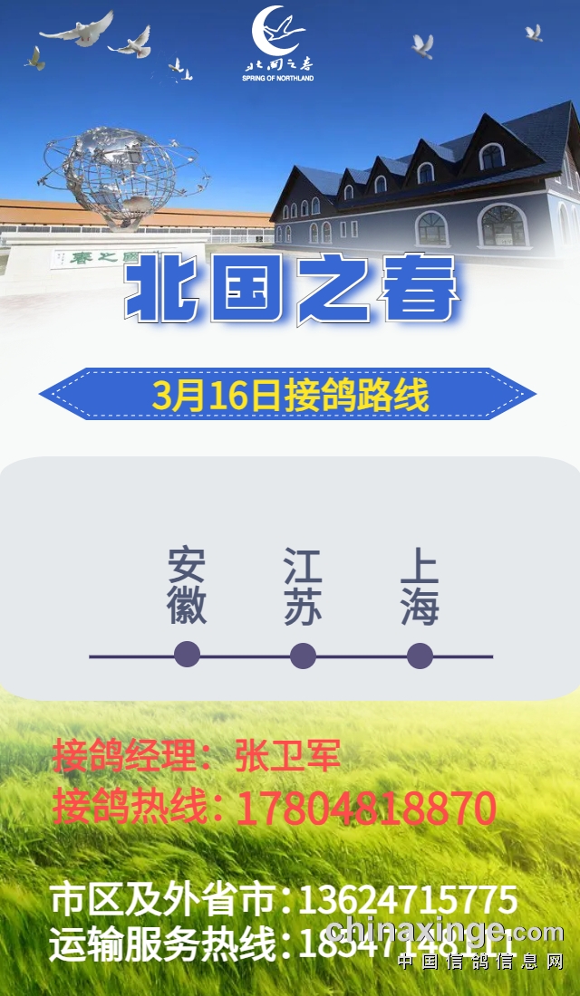 北国之春(小秋棚):3月16日安徽、江苏、上海接鸽计划