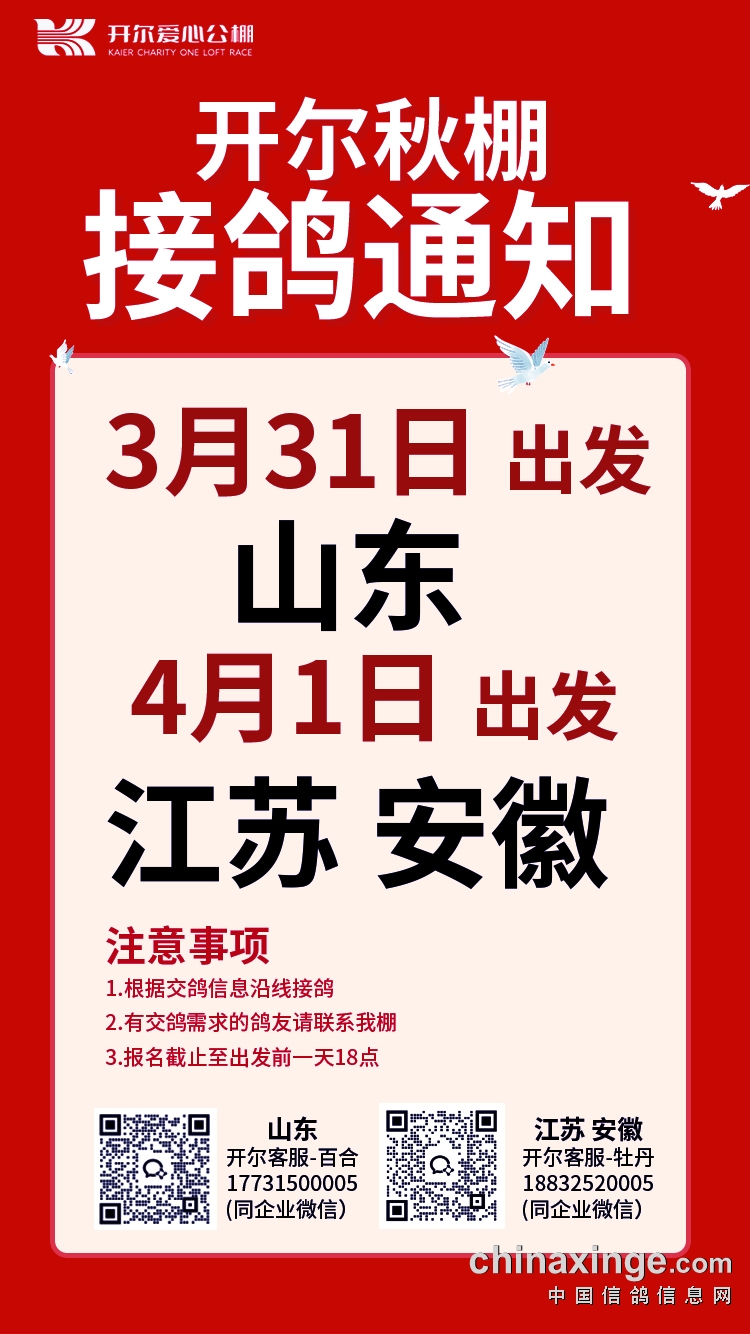 开尔爱心公棚(先锋队)3月31日山东,4月1日江苏、安徽接鸽通知