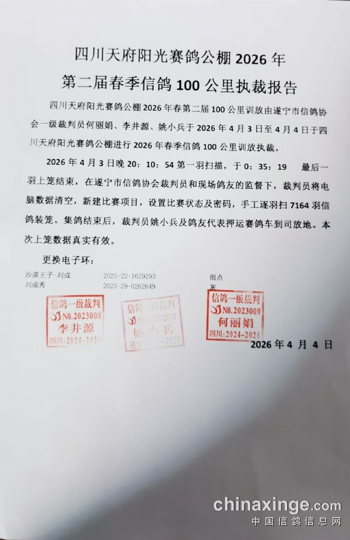 四川天府阳光赛鸽公棚(春棚) 2026年100公里技能赛规程