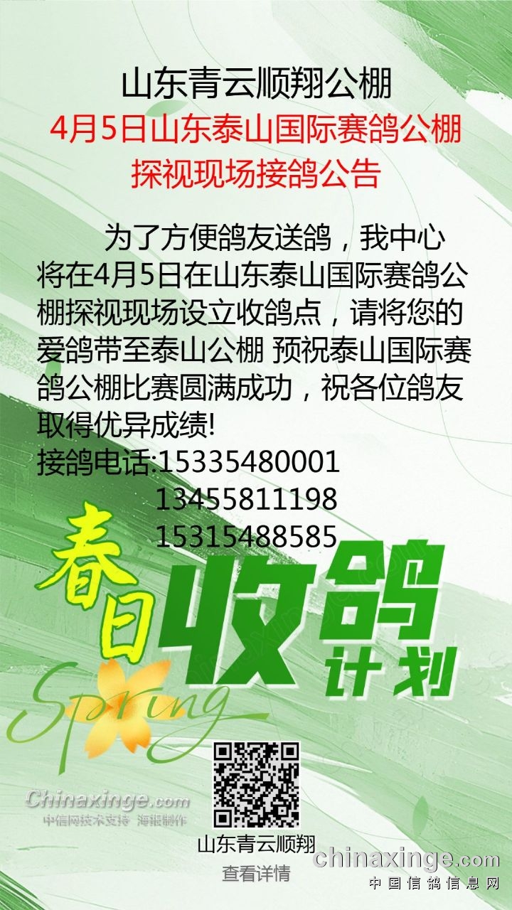 4月5日山东泰山国际赛鸽公棚探视现场接鸽公告