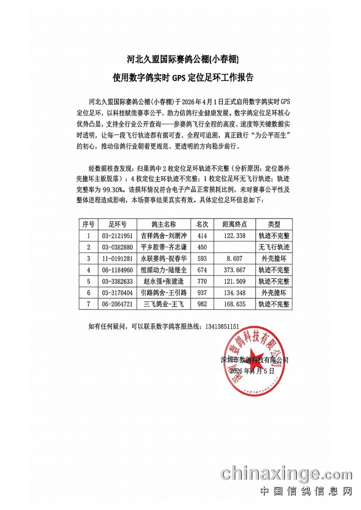 河北久盟国际赛鸽公棚(小春棚)数字鸽实时GPS定位足环工作报告
