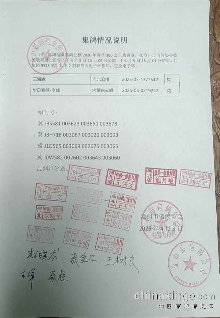 河北源翔精英赛鸽公棚180公里热身赛集鸽情况说明