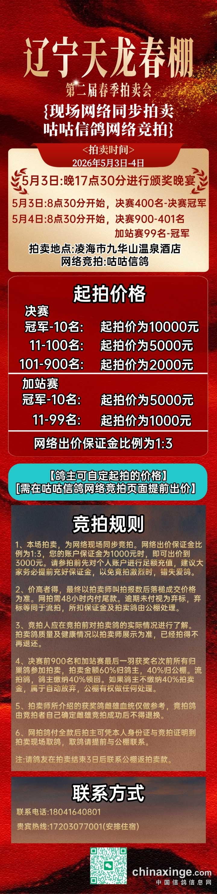 辽宁天龙春棚2026年决赛1-900名获奖鸽相片