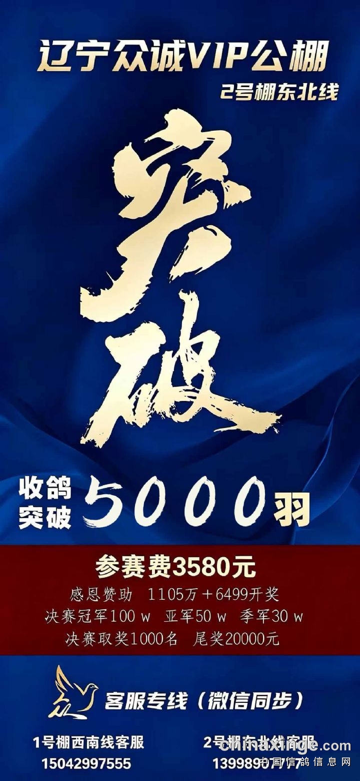 辽宁众诚VIP赛鸽公棚2号棚(东北线)于4月29日收鸽突破5000羽